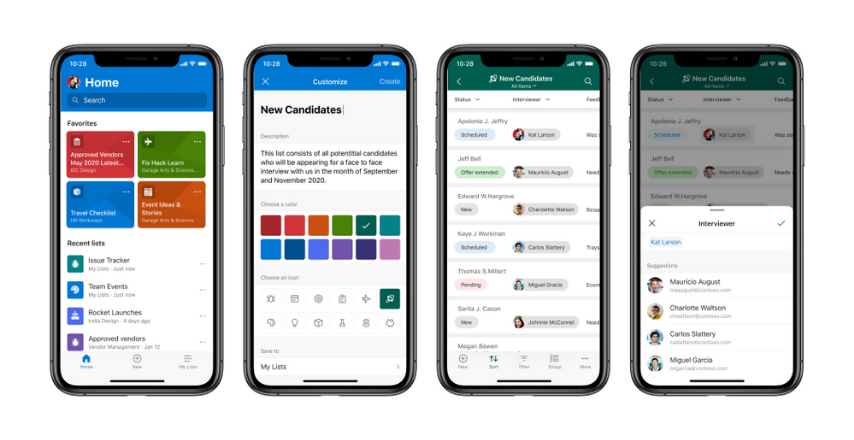 (From left-to-right, the Microsoft Lists app for iOS, shows various screens: Home page with favorite and recent lists, creating a list from ready-made templates, viewing lists items in a list, and editing a list item.)