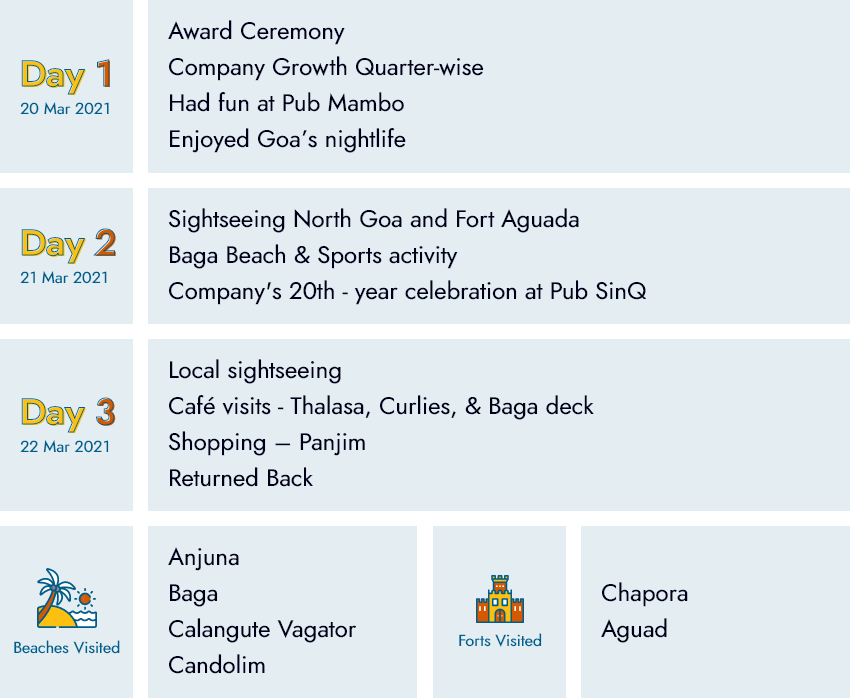 To felicitate the same culture, and boost employee morale our company decided to have its annual trip this year at Goa, India from 19th to 23rd March 2021.