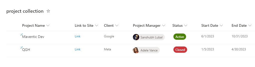 Think of it as a project dashboard. This custom list will include project names, incorporate a hyperlink column linking to the project sites, and allow you to track various project-related metadata, such as Project Manager, Start Date, End Date, Project Status, Budget, and more.