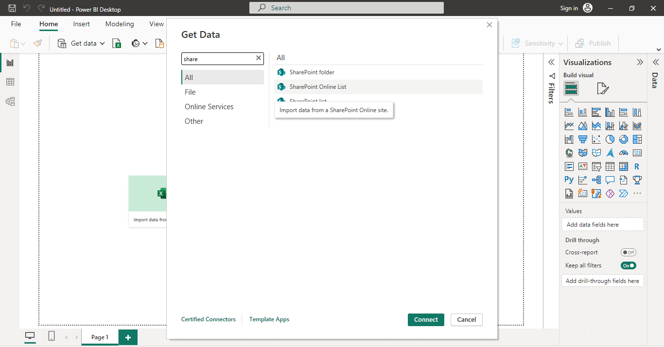 Within the upcoming window, efficiently locate the desired data source by typing “SharePoint” into the search bar. Subsequently, opt for “SharePoint Online List.” Once selected, proceed by clicking on the “Connect” button.