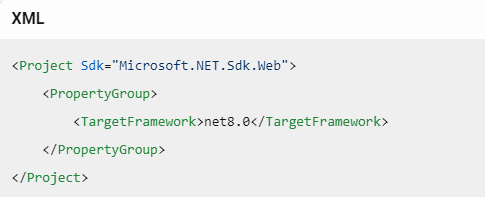 - In your project file (e.g., .csproj, .vbproj, or .fsproj), change the <TargetFramework> property to net8.0:
