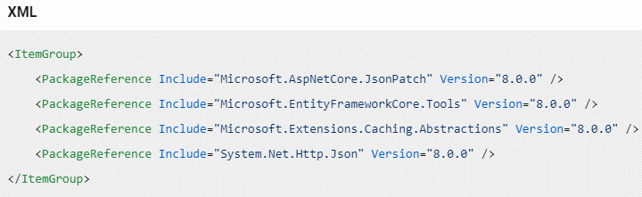 - In the project file, update package references for Microsoft.AspNetCore.*, Microsoft.EntityFrameworkCore.*, Microsoft.Extensions.*, and System.Net.Http.Json to version 8.0.0 or later: