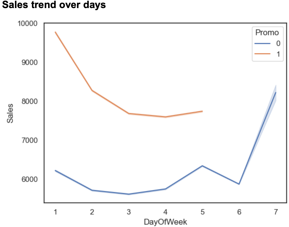 We can see from the above trend that there are no promotions on the weekends i.e. Saturday and Sunday, which makes sense as stores want to earn a maximum profit during the time when people do their house chores. The sales tend to increase on Sunday because people shop during the weekend. We can also see that the maximum sale happens on Mondays when there are promotional offers.