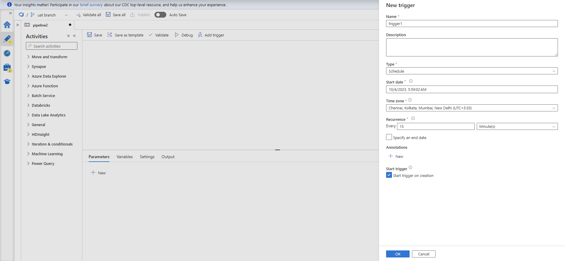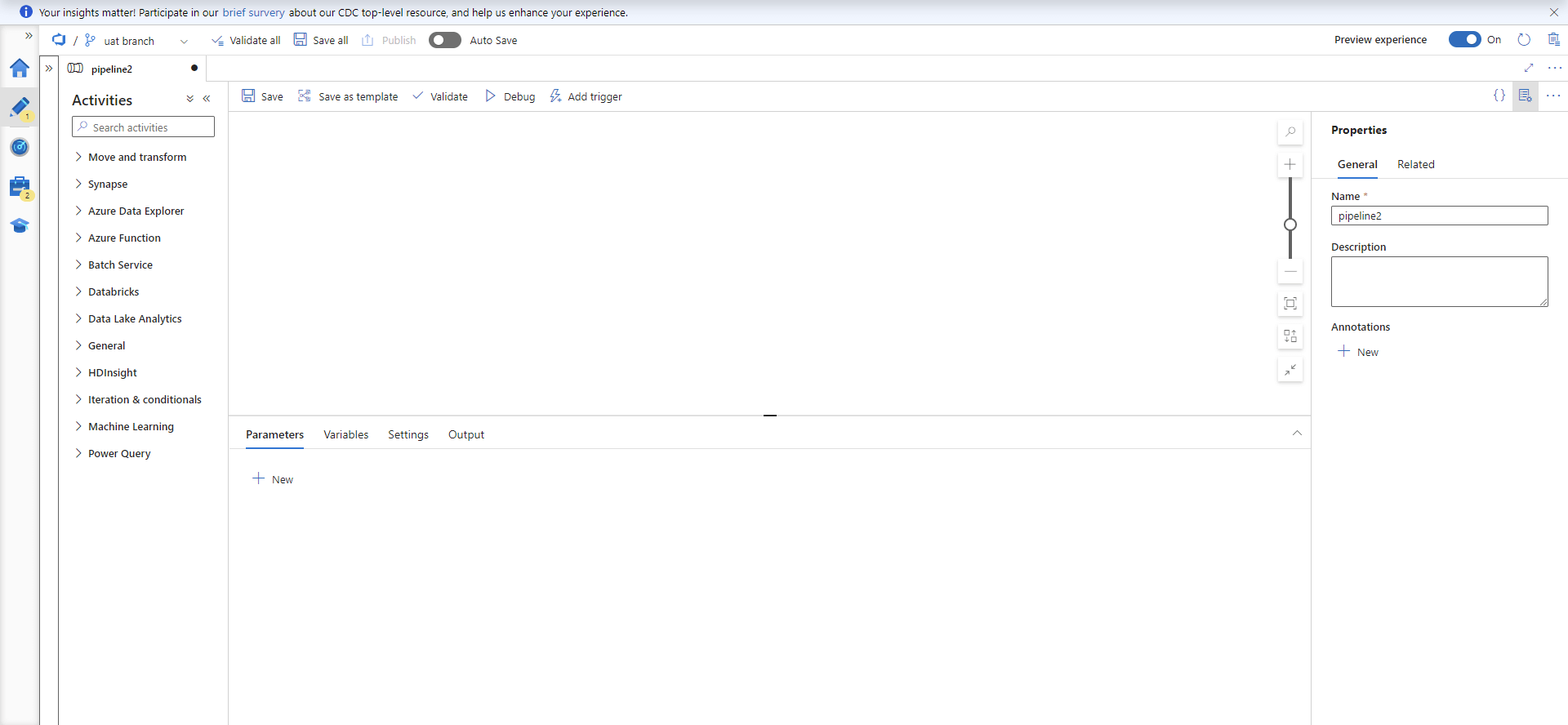 - Begin by crafting a fresh pipeline within Azure Data Factory. Then, follow these steps:
