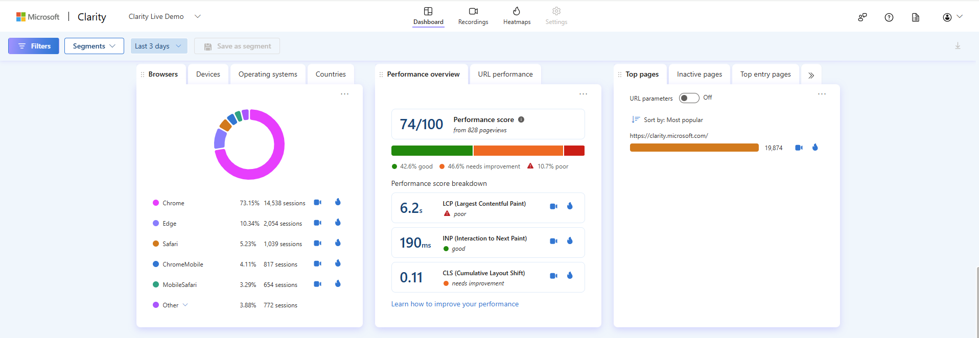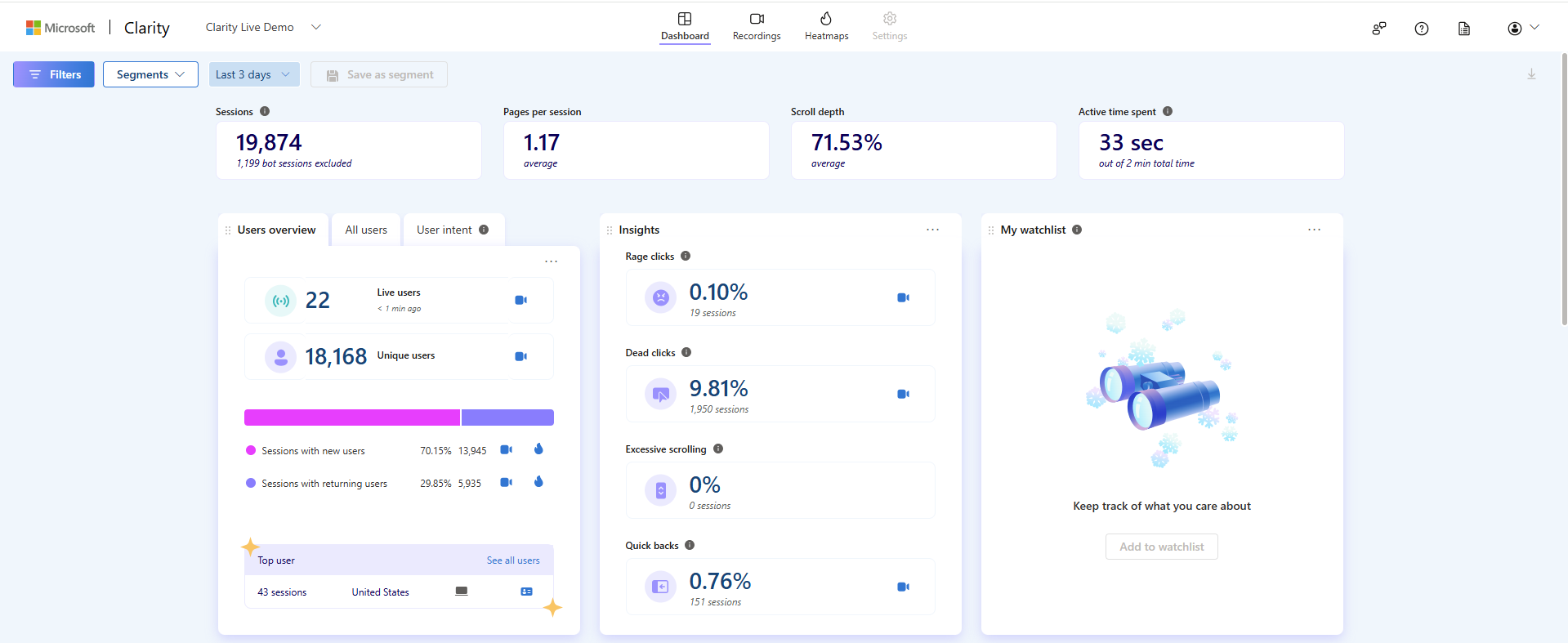 Clarity Insights are a set of Machine Learning (ML) based filters and recommendations on what content should be most important for you. The dashboard is helpful for designers, product managers, marketers, and web developers. Through the dashboard, you can understand the users without analyzing the ocean of data from user interactions.