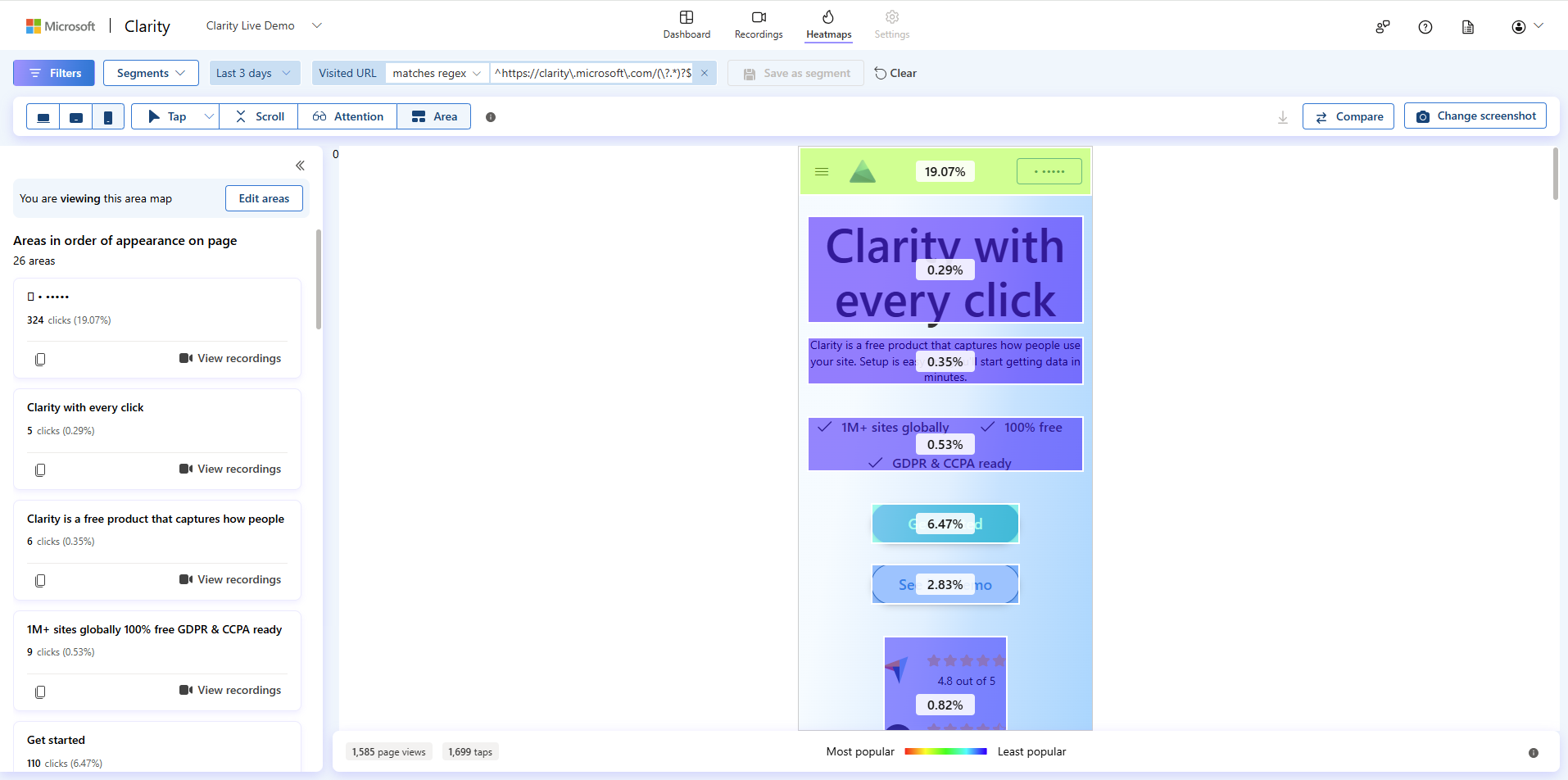 Clarity tracks all user taps on device and automatically generates a heat map. This data helps you identify the most engaged areas and figure out gaps.