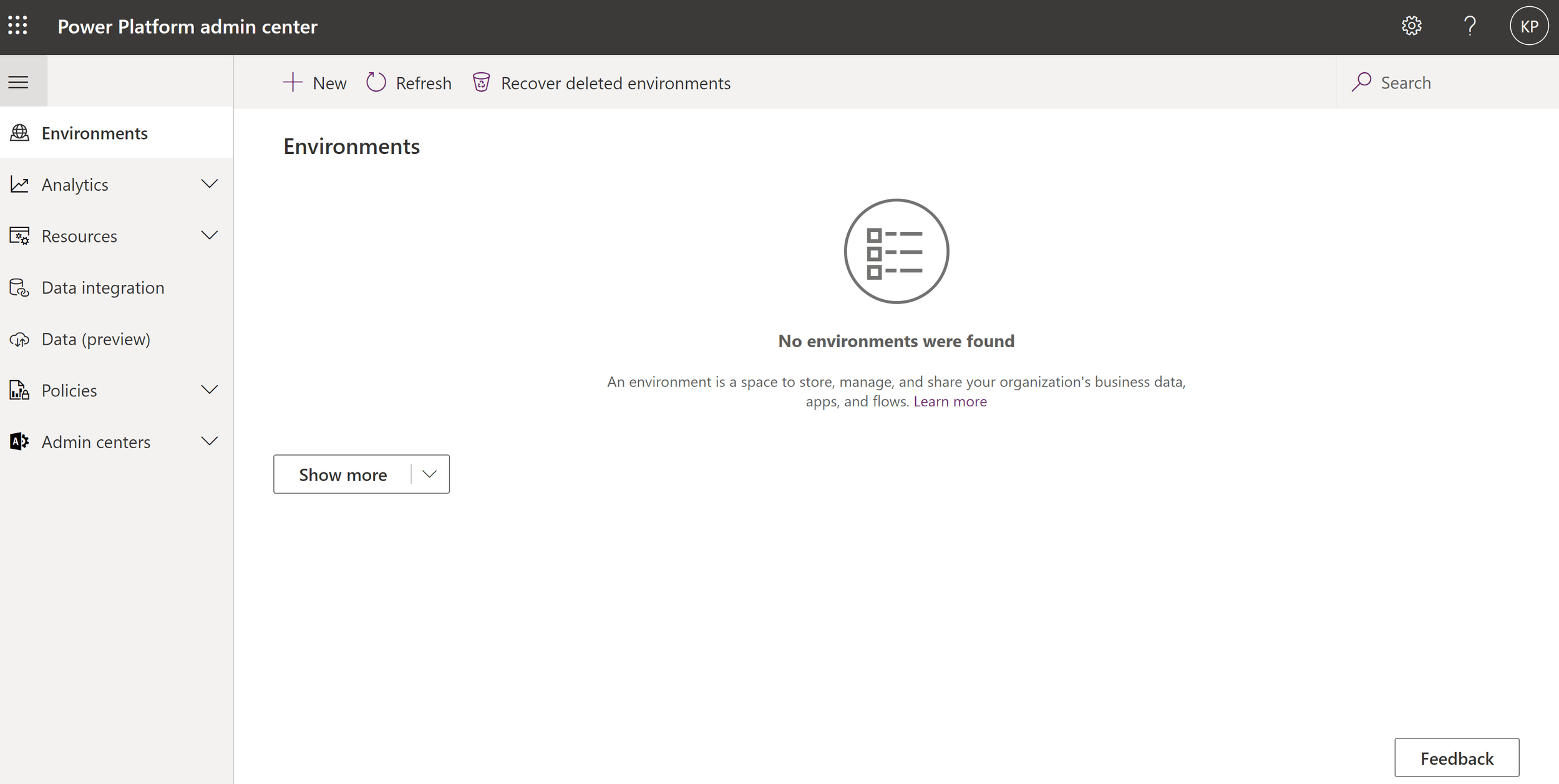 Utilizing Copilot for Power Automate Cloud Flows necessitates a Power Platform environment. To verify, visit the Power Platform admin center. If no environment is listed, initiate the creation of a new one by clicking the + New button on the page.